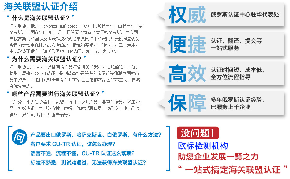 當(dāng)前,尤其以俄羅斯、哈薩克、白俄羅斯為主的俄語(yǔ)區(qū)國(guó)家的項(xiàng)目逐漸多起來。公平、公證、專業(yè)的第三方檢驗(yàn)服務(wù)也就成為了必然趨勢(shì);專業(yè)、高效、清晰的CU-TR/GOST認(rèn)證及認(rèn)證咨詢服務(wù)成為了需求品。然而,解決這些國(guó)家的產(chǎn)品準(zhǔn)入問題,是每個(gè)公司和制造商的比較頭疼的事情。