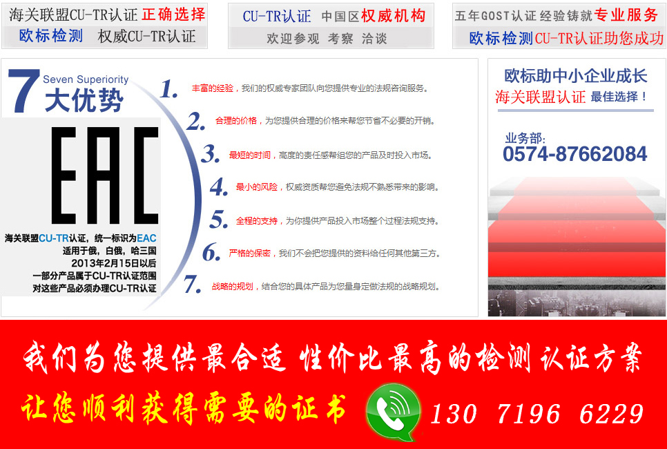 寧波歐標(biāo)檢測(cè)是目前俄羅斯聯(lián)邦集認(rèn)證服務(wù)、技術(shù)支持、標(biāo)準(zhǔn)檢測(cè)及證書頒發(fā)于一體的第三方認(rèn)證機(jī)構(gòu),專業(yè)開展海關(guān)聯(lián)盟認(rèn)證、EAC、EAEU、CU-TR認(rèn)證、TRCU認(rèn)證(CU-TR合格證書,CU-TR符合性聲明,SR-CU國(guó)家注冊(cè)證)、自愿性GOST-R證書、烏克蘭認(rèn)證、RTN認(rèn)證,豁免函等。